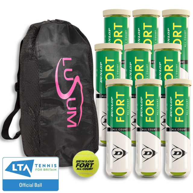 Dunlop Fort All Court tennis balls are supplied with a Lusum tennis ball bag capable of holding up to 60 tennis balls. The bag has a shoulder strap and a drawstring closer for ease of transportation.