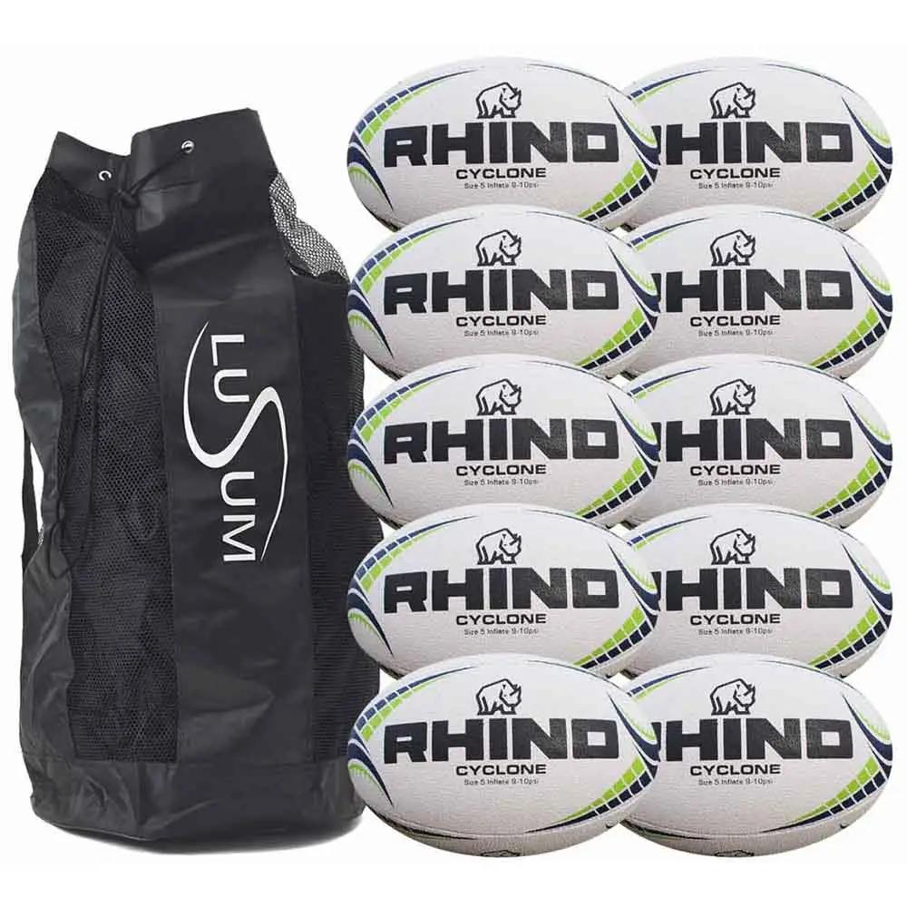 This Rhino rugby ball set includes 10 Rhino Cyclone rugby balls and a heavy-duty Lusum breathable ball bag. The Cyclone balls have an impressive 3-dimensional grip (3D), which adds to the durability of the ball and gives it a longer life.
